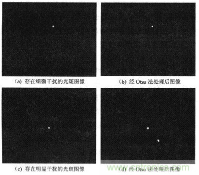 圖4為拍攝到太陽光斑存在干擾時的圖像,對比圖4(a)和圖4(b)可發現用Otsu法分割處理后,能有效消除圖像中細微干擾。圖4(c)由Otsu法處理后得到圖4(d),光斑圖像坐標(160,120),光斑個數為2,對應FYP和FWP為O。由此判斷拍攝的圖像存在明顯干擾,程序將FYP和FWP置為O,確保系統的可靠性。