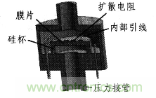 所設(shè)計的壓阻式壓力微傳感器,其制法是將N型硅腐蝕成厚10~25μm的膜片,并在一面擴散了4個阻值相等的P型電阻。硅膜片周邊用硅杯固定,則當(dāng)膜片兩面有壓力差時,膜片即發(fā)生變形,從而導(dǎo)致電阻變化。用微電路檢測出這種電阻變化,通過計算即可得出壓力變化如圖2所示。