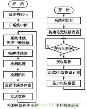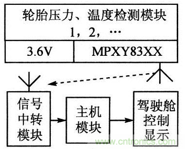 由安裝在輪胎內(nèi)部的檢測模塊,實時測量胎內(nèi)壓力、溫度,并將壓力、溫度信號通過無線方式發(fā)送出去。安裝在駕駛室內(nèi)的主控模塊接收無線信號,經(jīng)過數(shù)據(jù)處理,再由顯示裝置顯示出測量結(jié)果,實現(xiàn)行駛過程中輪胎狀況的實時監(jiān)控。TPMS基本結(jié)構如圖2所示。