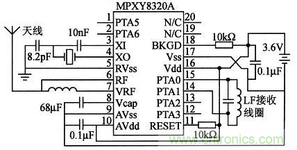 檢測模塊由胎壓測量專用高集成芯片MPXY8320A微控制器和電源組成,檢測模塊電路原理如圖4所示。MPXY8320A工作在DC 2.1~3.6 V,具有低功耗的效能以延長電池壽命。MPXY8320A最大的特點是,其內(nèi)部集成了8位MCU、適應載重型輪胎的壓力傳感器、溫度傳感器、供電電源電壓監(jiān)測、X-Z軸上的加速度傳感器以及RF發(fā)送模塊,所以MPXY8320A是一款專為交通工具胎壓測量而設計的高集成芯片。由于器件的高集成度,在體積上、功耗上、電磁兼容性方面都有很出色的表現(xiàn)。