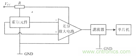 本系統中的第一部分由圖3中的霍爾傳感器裝置提供,由霍爾元件(A44E)、差分放大器和濾波器組成。其輸出電壓與霍爾元件位移成比例,具有較高靈敏度,能夠產生出符合要求的電壓信號。