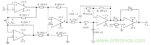 放大處理后的電壓信號,雖然在幅值上達到了可以處理的范圍,但模/數電壓轉換的范圍是0~5 V,而傳感器輸出的電壓存在負值,為了使電壓匹配,信號電壓在接人模/數轉換器前可以加一級加法電路,將電壓信號全部轉換為正值。放大電路、濾波電路和加法電路均使用LM324實現,硬件電路如圖4所示。