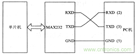 該設計中采用異步串行通信的方式。而AT89C51 單片機的串行口,當工作于方式1,2和3時,UART(通用異步接收和發送)可以實現單片機系統與PC機之間的串行通信。PC機串行通信主要是通過串行口芯片8251實現的。8251有10個寄存器,端口地址從3F8H~3FEH(c0M1),可以通過對8251編程來指定通信協議即通信的波特率、數據位數、奇偶類型和停止位長度。另外由于Pc機串口的電平是RS 232電平,不與單片機串口的TTL電平兼容,因此需要在它們之間進行電平轉換。傳統的方法是使用MCl488將TTL電平轉換成RS 232電平,用MCl488實現反向轉換,由于MCl488需要±12 V電壓,使用中非常不便,故該設計采用MAXIM公司的產品片MAX232來實現,由單+5 V的電壓供電,既可實現TTL到RS 232的電平轉換,也可實現RS 232到TTL電平的轉換,使用十分方便,具體的線路如圖5所示。