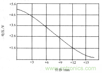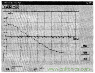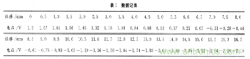 從圖7中PC機界面顯示位移一電壓坐標圖,表1記錄的數據以及圖8在示波器上顯示的霍爾線性電路理想電壓一位移曲線圖相比較,可以發現由于傳感器實驗臺受外界干擾等原因使得輸出信號輸出誤差在所難免,而且沒有電平轉換,使得VB繪圖中得到的數值存在負值;但是可以在圖中看到傳感器輸出的電壓值在正負之間有明顯的對稱性,與要求輸出的理想輸出信號波形相符合,證明本系統運行良好,設計的非常成功。