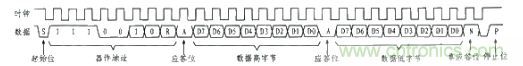 DX75LX的讀寫操作是通過兩線串行總線接口實現的,該串行總線與I2C總線兼容。圖2所示為讀溫度及溫度門限寄存器的時序圖。此時假定寄存器指針已指向溫度寄存器,否則需要對指針進行設置。設置方法如下:主器件產生起始位、發送包含DS75LX地址的寫命令、收到應答、發送寄存器指針字節。注意只有指針字節的低兩位(P1、P0位)有效。