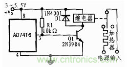這些默認值可使該溫度傳感器在不連接串行總線時用作自動調溫器,圖4所示就是AD7416作為自動調溫器的典型應用電路原理圖。當被測量的環(huán)境溫度低于 THYST時,OTI輸出高電平,Q1導通,繼電器吸合,加熱器開始工作;當被測量的環(huán)境溫度高于TOTI時,OTI輸出低電平,將Q1的基極電位拉低以使其截止,繼電器釋放,加熱器停止工作。