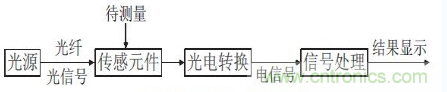 隨著工藝水平的提高,光纖技術目前相對成熟。光纖傳感器即為應用光纖傳輸?shù)幕驹斫M合的一個廣電感應系統(tǒng)。通常的光纖傳感系統(tǒng)由光源、光導纖維、光傳感元件,光調(diào)制元件和信號處理部分組成。其工作原理如下圖所示:光源發(fā)出的光經(jīng)過光導纖維進入光傳感元件,而在光傳感元件中受到周圍環(huán)境場的影響而發(fā)生變化的光再進入光調(diào)制機構(gòu),由其將傳感元件測量的參數(shù)調(diào)制成幅度、相位、偏振等信息,這一過程稱為光電轉(zhuǎn)換過程,最后利用微處理器進行信號分析。