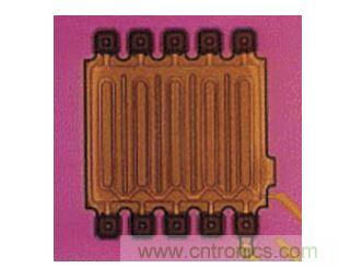 電容式壓力傳感器利用MEMS技術在硅片上制造出橫隔柵狀,上下二根橫隔柵成為一組電容式壓力傳感器,上橫隔柵受壓力作用向下位移,改變了上下二根橫隔柵的間距,也就改變了板間電容量的大小,即△壓力=△電容量(圖5)。電容式壓力傳感器實物如圖6。