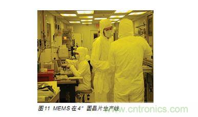 與傳統IC行業注重二維靜止的電路設計不同,MEMS以理論力學為基礎,結合電路知識設計三維動態產品。對于在微米尺度進行機械設計會更多地依靠經驗,設計開發工具(Ansys)也與傳統IC(如EDA)不同。MEMS加工除了使用大量傳統的IC工藝,還需要一些特殊工藝,如雙面刻蝕,雙面光刻等。MEMS比較傳統IC,工藝簡單,光刻步驟少,MEMS生產的一些非標準的特殊工藝,工藝參數需要按照產品的要求來進行調整。由于需要產品設計、工藝設計和生產三方面的密切配合,IDM的模式要優于Fabless+Foundry的模式。MEMS對封裝技術的要求很高。傳統半導體廠商的4〃生產線正面臨淘汰,即使用來生產LDO,其利潤也非常低,但是,如果生產MEMS,則可獲得較高的利潤。4〃線上的每一個圓晶片可生產合格的MEMS壓力傳感器Die5-6K個,每個出售后,可獲成本7-10倍的毛利(如圖10)。轉產MEMS對廠家的工藝要求改動不大,新增輔助設備有限,投資少、效益高。MEMS芯片與IC芯片整合封裝是集成電路技術發展的新趨勢,也是傳統IC廠商的新機遇。圖11是MEMS在4〃圓晶片生產線上。