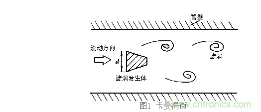 根據卡曼渦街理論(見圖一),在無限界流場中垂直插入一根無限長的非線性阻力體(即旋渦發生體C,風速傳感器的探頭橫桿),當風流流經旋渦發生體C時,在漩渦發生體邊緣下游側會產生兩排交替的、內旋的旋渦列(即氣流旋渦),而旋渦的產生頻率f正比于流速V,用公式表示如下: