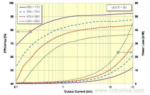 LM5165 中內(nèi)置的面向智能傳感器應(yīng)用的各種特性包括一種用于實(shí)現(xiàn)最佳解決方案尺寸的簡單控制架構(gòu)、用于提供低壓差的 100% 占空比能力、一個(gè)用于電源軌排序和故障報(bào)告的漏極開路電源良好指示電路、在內(nèi)部固定或從外部可調(diào)的軟起動(dòng) (SS)、以及具有可定制遲滯以提供可編程線路欠壓閉鎖 (UVLO) 功能的高精度啟用。而且,一種可調(diào)的逐周期電流限制優(yōu)化了電感器選擇和尺寸。圖 3 顯示出了對(duì)于 0.1mA 至 30mA 負(fù)載電流的轉(zhuǎn)換器效率和功率耗散。