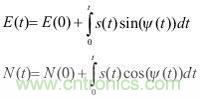 其中,(t)是位移,(t)是航向。在行人步伐間隔期間,假設速度和航向是常量。考慮到折線法,方程式1可改寫成: