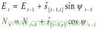 方程式2表述航位推算(DR)算法,該方法是基于步數計算,而不是加速度和角速率的積分運算。方程式2的航位推算過程有三個要素:1)在t-1 (Et-1, Nt-1)時最后一次已知的用戶絕對位置(用東北坐標系表示);2)從t-1到t()的步長;3)從時間t-1開始的航向 (ψ) 可以算出新位置相對已知位置(Et-1, Nt-1)的坐標(Et, Nt),如方程式2所示。