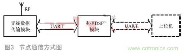 在傳感器網絡中,采用ZigBee通信協議時,節點被分為Coordinator、Router以及End Device三種。Coordinator負責系統的初始化工作,選擇網絡的信道等參數建立網絡,供其他節點加入;Router負責節點之間命令消息的路由轉發實現;End Device負責任務是消息的發送和接收,只能和父節點進行數據通信,不具有路由轉發的功能。在本系統中,Sink節點主要負責監控網絡的建立、上位機命令的分析處理和操作、數據的收集等任務,是整個網絡的數據存儲和處理中心,在上位機和監控網絡之間起到橋梁的作用,是系統應用中的Coordinator。監控網絡區域內的待定位節點要具備消息轉發與路由其他節點的能力,需要可以給所有節點發送消息,也可以接收到所有節點的消息,是系統應用中的Router。每個節點由無線數據傳輸模塊和主控DSP模塊組成,同一節點的兩個模塊之間通過UART總線進行通信。節點之間通過無線RF射頻方式進行通信。Sink節點與上位機使用UART總線進行通信,未知節點的通信方式中并不包含該通信方式。節點的通信方式如圖3所示。