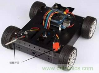 在機(jī)器人比賽中,碰撞開關(guān)經(jīng)常被用在碰撞壁障小車上(見圖3)。小車前端的碰撞開關(guān)在碰撞到障礙物時就會給控制器反饋一個信號,告訴控制器前方左側(cè)或右側(cè)有障礙物,程序再控制小車轉(zhuǎn)彎避開障礙物。