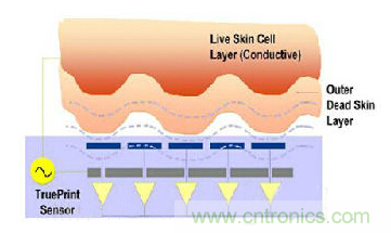 其原理是將電容感整合于一塊芯片中,當指紋按壓芯片表面時,內部電容感測器會根據指紋波峰與波谷而產生的電荷差,從而形成指紋影像。如下簡圖,可以把上面的凹凸認為是指紋的谷和脊,那么同傳感器就會形成不同的電容差,這樣傳感器就可以根據這些不同的電容差畫出指紋的紋理。