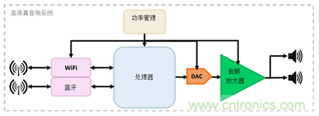 處理器執(zhí)行各種音頻處理功能,如解碼和信號均衡,同時也處理Wi-Fi和/或藍牙通信軟件堆棧。過去,CD品質的采樣頻率可能已足夠。但是今天的高保真音頻系統(tǒng)對信號鏈中的處理器提出了其它要求,因為高保真音質要求在24位音樂信號流中提供48kHz至192kHz范圍內(nèi)的采樣率。