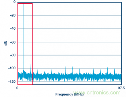 有多種方法可以減少落入紅框內的噪聲量。其中一種是選擇具有更好SNR(噪聲更低)的ADC。或者也可以使用相同SNR的ADC并提供更快的時鐘(比如150 MHz),從而讓噪聲分布在更寬的帶寬內,使紅框內的噪聲更少。