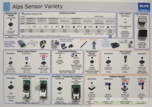 日本阿爾卑斯電氣株式會社(Alps Electric)展示其傳感器組合(下圖),這同時也可作為傳感器領域應用多樣化的一個指標。該公司并未在活動中發表新芯片,而是與網關供貨商、美國云端運算軟件供貨商Mode連手展示使用其模塊開發的端對端物聯網解決方案。