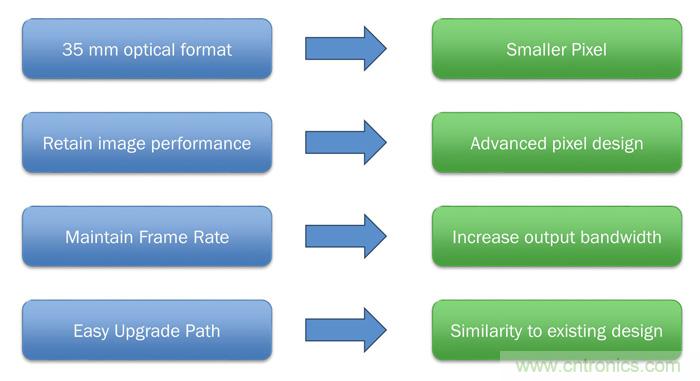 為了在保留35 mm光學格式的同時,將器件(例如KAI-29050)的分辨率從現有的2900萬像素繼續提升,就需要更小的像素格式,以便將更多像素放置于給定區域中。但為同時保留這一較小像素中的關鍵成像參數,如圖像均勻性、動態范圍和底噪,除了簡單地縮小尺寸外,還需要提升像素設計。