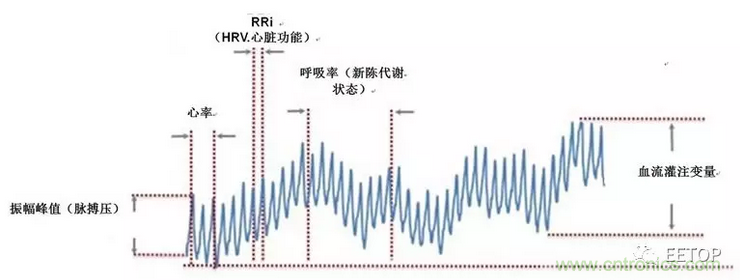 光學(xué)心率傳感器可生成測量心率的PPG波形并將該心率數(shù)據(jù)作為基礎(chǔ)生物計量值,但是利用PPG波形可以測量的對象遠(yuǎn)不止于此。盡管很難取得和維護(hù)精確的PPG測量結(jié)果(我們將在下一篇詳細(xì)論述它),但是如果您能夠成功獲得精確的PPG測量結(jié)果,它將發(fā)揮強大的作用。高品質(zhì)PPG信號是當(dāng)今市場需求的大量生物計量的基礎(chǔ)。圖2是經(jīng)過簡化的PPG信號,該信號代表了多個生物計量的測量結(jié)果。