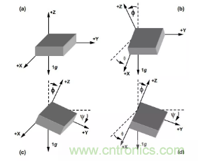 雙軸加速傳感器可以保證XY平面上的傾斜角檢測。但是在實際應用中,很難保證傾斜只發生在XY平面。加上第三條軸之后,便可全面掌握物體的運動狀態。三軸加速度傳感器除了像雙軸加速度傳感器一樣,可以分別計算出在XY平面、YZ平面、XZ平面的傾斜角外。還可以計算出每條軸與參考位置的夾角。圖1, XYZ三軸與參考位置的夾角。
