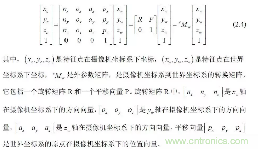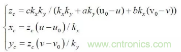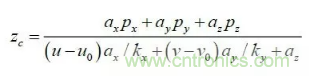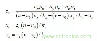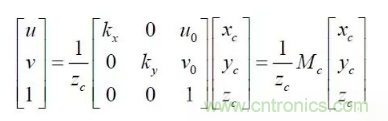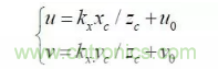 其中:(u,v)是特征點的圖像坐標,(u0,v0) 光軸中心的圖像坐標,(kx ky )是X 軸,Y 軸方向的放大系數,(xc yc zc) 是特征點在攝像機坐標系下坐標, Mc 是攝像機內參數矩陣。