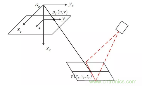 我們不考慮鏡頭的畸變,將相機的成像模型簡化為小孔成像模型,則特征點的圖像坐標Pf 與其在攝像機坐標系下的三維坐標P 之間的關系可表示為: