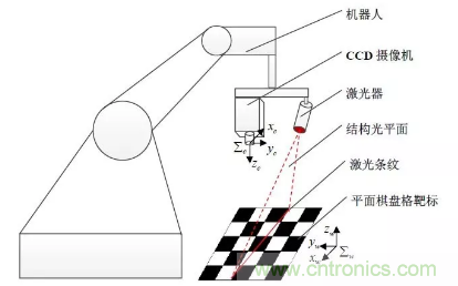 一個六自由度機器人,一個CCD 工業攝像機,一個激光器和一個平面棋盤格靶標。