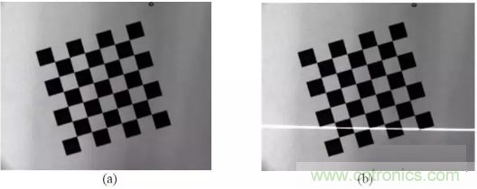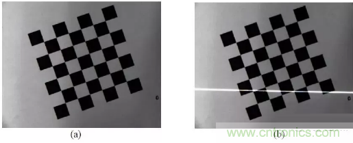 圖像的獲取是在攝機參數標定過程中同時完成。 首先將棋盤格放在工作臺上, 在這個初始位置,利用攝像機采集一幅圖,如圖 (a) 所示 。保持攝像機和棋盤格的位置姿態不變,打開激光器讓條紋投射到棋盤格上, 再采集一幅圖像如圖 (b) 所示: