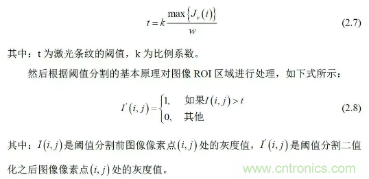 根據圖像中激光條紋的灰度值高于圖像中其它像素的灰度值以及激光條紋所在區域比較集中的特點,利用圖像ROI 內行像素灰度值之和計算激光條紋的自適應閾值: