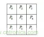 攝像機坐標系位于攝像機中心,而世界坐標系位于平面棋盤格靶標上。一個特征點在攝像機坐標系下坐標與其在世界坐標系下坐標之間的對應關系可以用下式來表達: