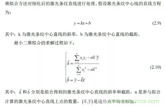 選取激光條紋中心線上的兩個點作為激光條紋的特征點,為了提高激光條紋中心線的提取精度,利用最小二乘法擬合方法對細化后的激光條紋直線進行處理。