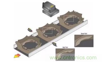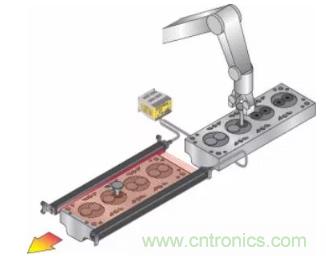 在流程的下一步驟之前驗(yàn)證關(guān)鍵部件是否到位并處于正確位置是一項(xiàng)常見要求。光電傳感器可以輕松實(shí)現(xiàn)這一目標(biāo),最新型號甚至可以檢測零件的最小和最窄邊緣。在圖示中,兩個(gè)傳感器可以形成僅為百分之一英寸的會聚點(diǎn),以精確地檢測半導(dǎo)體晶片的邊緣。在該示例中,傳感器不僅驗(yàn)證晶片的存在,而且還可以檢測晶片是否在盒中傾斜。