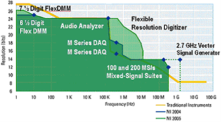基本上,虛擬儀器系統(tǒng)是基于軟件的,所以如果只要是可以數(shù)字化的東西,就可以對(duì)它進(jìn)行測(cè)量。因此,測(cè)量硬件可在通過(guò)兩根坐標(biāo)軸進(jìn)行評(píng)估,即分辨率(位)和頻率。參考下圖可以看出虛擬儀器硬件測(cè)量性能與傳統(tǒng)儀器的比較。NI的目標(biāo)就是將曲線(xiàn)在頻率和分辨率上延伸并且在曲線(xiàn)內(nèi)進(jìn)行不斷推陳出新。