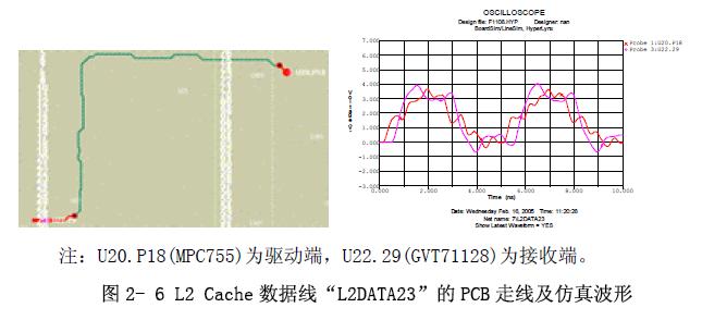 因為板上這兩個總線的負載最多為2個負載,且這幾個芯片之間的距離很近,相關(guān)的PCB走線很短,所以信號時序關(guān)系一般能夠滿足要求(盡管其工作頻率很高)。下面給出L2Cache總線上典型時鐘線、地址線以及數(shù)據(jù)線的PCB走線圖以及在HyperLynx仿真軟件的BoardSim工具下的仿真波形。MPC755、MPC107、PowerSpan和GVT71128芯片的IBIS模型均來自于芯片廠商(Motorola、TUNDRA和GALVENTECH)。